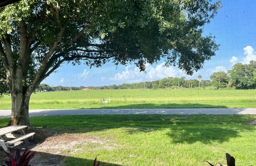 A home with stunning views of an open pasture, elegant mature trees that embrace calming waters at the back of the property. Enjoy your stay in a spacious living area and a newly redesigned kitchen. Minutes from Lake Okeechobee, known for great fishing, along with a stones throw from downtown.
