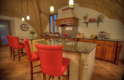 This beautiful luxury apartment has been carefully restored. It boasts all modern conveniences while maintaining its original 16th century vaulted ceilings and exposed tufo walls. The kitchen has a professional 5 burner gas stove top & oven, Miele dishwasher, built-in microwave, double door fridge/freezer and 2 islands. The open concept dining seats 8. The living area hosts seating for 8 and a large screen TV. The master suite includes access to the private terrace, king bed, seating area and a large bath with walk-in shower & tub. Two separate guest rooms include 2 twin beds, 1 queen bed, a shower room and 2 pc. bath. The terrace has a large seating area for 4, a spacious dining table for 8 and a smaller seating area for 2. This apartment is air-conditioned.