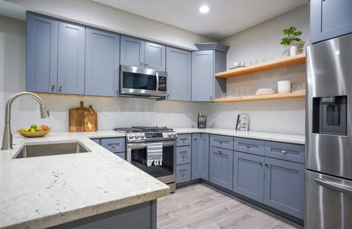 Our other standard amenities really put life in a cramped, cookie-cutter hotel room to shame: you'll have a full kitchen, laundry, fast WiFi, a smart TV, and total privacy for your stay. Our homes all feature Ring doorbell cameras and custom-coded keyless entries, so you can rest easy knowing your security is top notch. You won't be shelling out big bucks each day to park in a twisty multi-story deck either, as all of our properties have free off- or on-street parking.