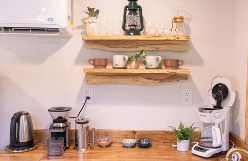 Escape to 'Fairy Fire,' a modern tiny cabin nestled in the woods of Red River Gorge. Named after the magical bioluminescent fungus discovered in a tree on the property, this thoughtfully designed retreat combines contemporary comfort with natural beauty. The very same tree now lives on throughout the cabin—transformed into beautiful countertops, the fireplace mantel, and accent pieces that tell a story of sustainable craftsmanship.