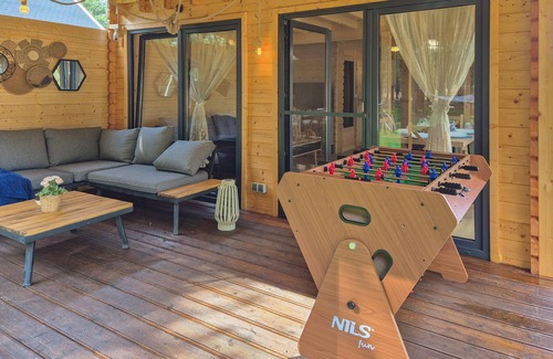 Welcome to a holiday in this holiday home in Nowe Warpno, which is ideal for families or groups looking for relaxation and a lively holiday in equal measure. Enjoy the tranquillity of the surrounding nature while you linger on the cosy veranda. Make yourself comfortable on the cosy sofa or compete with friends or family at the table football table. Fun and entertainment are guaranteed here. There are numerous games such as petanque and badminton. And for our younger holiday guests, there is a variety of play equipment available. Everyone can relax in the soothing barrel sauna.