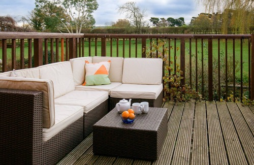 French windows open out from the dining area to a south-facing, raised sundeck, with a fabulous view over the garden. The deck has comfy, rattan-style sofa seating and a coffee table. It's a beautiful space to relax with a drink after a day exploring the local attractions in the Cotswolds and Warwickshire. A gate (with bolt) opens to a staircase that leads down to the garden and patio.