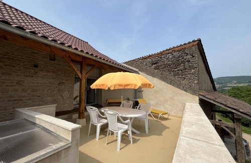 Charming authentic, typical 18th century Burgundian farmhouse, carefully restored (with a traditional "Mâconnaise gallery"), nestled against a wooded hill on a south-eastern slope, nestled in a quiet area on the edge of a lane (organic farm located opposite the gîte) just a stone's throw from the heart of a peaceful, typical, and perfectly preserved little village, full of charm and steeped in history (a major resistance centre during the Second World War). Nestled in the heart of gentle rolling countryside, in the hollow of a bucolic valley, at the foot of Mont Saint-Romain (listed natural site, exceptional belvedere culminating at 580m offering a 360° view as far as Mont-Blanc on a clear day & renowned downhill mountain bike trail), Blanot benefits from an absolutely enchanting landscaped setting, combining hedged meadows, beautiful wild forests & vineyards (largely protected in "Natura 2000 Zone" for its rich fauna & flora), has a rich heritage (rare Cluniac Priory from the 13th century, old wash houses, bread oven, historic houses restored with galleries & lava roofs, Merovingian tombs from the 6th & 7th centuries etc.) and is home to renowned "Grottes" (jewel of the Cluniac region, classified as a ZNIEFF for the protection of rare species of bats). Very comfortable cottage converted into a former hayloft. Warm, contemporary country charm. A peaceful, zen atmosphere. A refined, cozy, and enveloping cocoon. A pleasant, large, panoramic balcony-terrace offering a beautiful, unobstructed view of the countryside and the village, where its elegant Romanesque church stands. Composition: Semi-detached village house. Fiber optic Wi-Fi. Heat pump + wood-fired central heating. Air conditioning. 1st floor (access via stairs leading up from the outside). Living room-kitchen-lounge (double sofa bed, 160x200cm), bedroom (double bed, 160x200cm), bathroom (shower), separate toilet. Balcony-terrace (20m²) + garage (1 space / bicycle storage). Mini-market 7.5 km. All amenities, including supermarkets, 11 km.