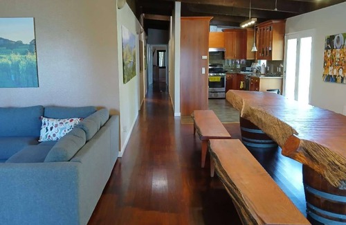 This family vacation house is located in the Green Valley of Sonoma County. The house is on the Ektimo Winery grounds. It offers 2 large master bedrooms, a guest bedroom, and an additional room with a queen bed. There are 3 bathrooms. The main area is an open space with a living room, dining room and kitchen. The bedrooms are located on each side of a long hallway.