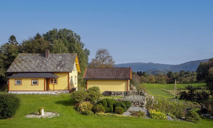 Beautiful timber house "Gulehuset", 61 m a.s.l.. 2 km from the centre of Bruntveit/Reksteren, 20 km from the centre of Uggdal, 71 km from the centre of Bergen, 3 km from the lake, 600 m from the fijord, in the countryside. For shared use: property 8'000 m2 with meadow. Bathing place, fish-processing table. Motor boat (on order), parking on the premises. Shop 2 km, supermarket 24 km, bus stop "Esvær" 400 m, railway station "Bergen" 71 km, ferry "Bergen" 71 km, pebble beach 600 m (small). Fishing possibilities 600 m. Table for fish gutting available (shared use).
