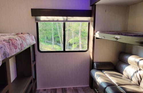 RV camper with queen bedroom, bunk room and two bathrooms. Situated on the edge of our 200 acre farm, enjoy wildlife viewing and access to hiking trails throughout the farm. One mile from the Buckhannon river. Side by sides welcome. Towels and linens provided, kitchen is stocked with pots/pans, dished and utensils. Outdoor chairs, picnic table and firepit, just bring your clothes and food.
