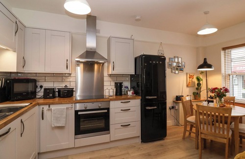 Amenities: Electric central heating. Electric oven and hob, kettle, toaster, microwave, fridge/freezer, washing machine, tumble dryer, dishwasher. TV, WiFi. Fuel and power inc. in rent. Bed linen and towels inc. in rent. Roadside parking available outside for loading and unloading and additional unrestricted roadside parking available nearby on a first-come, first-served basis. Small enclosed rear courtyard with furniture. Sorry, no smoking and no pets. Shop 0.1 mile, pub 0.2 miles, beach 0.9 miles. Note: There is a step leading up into the open-plan living space and four steps leading up into the bedroom, please take care