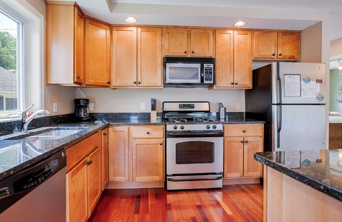 Just inside the entry way to your left, you'll find the spacious, first floor master bedroom with a queen size bed. To the right of the entry way is a conveniently located laundry room with full size washer and dryer.