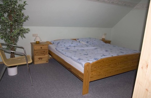 The two-family house is located on the outskirts of the village Bischofroda in a quiet location of a new housing development (built in 1993- 1995). Extensive meadows surround the 1000 m large property which are used for grazing sheep, horses and cows. The apartment is located on the 2nd floor of the house. The 3 room apartment with kitchen and bathroom (all rooms have windows) was renovated in 2003. In the kitchen there is the regular furniture, an electric cooker with 4 hotplates, a fridge, freezer, microwave, a coffee maker, a toaster and dishes, glasses, cutlery, pots etc. as well. Furthermore there is a dining area for 4 to 5 People. The kitchen is directed at the east side with a view towards the Hainich, the orchards and fields in front of it.The morning sun floods the room. The bedrooms are functional with a double bed or 2 single beds with the included bedside tables and lighting. Each room have a three-door or two-door wardrobe. Bed linen is provided. Both rooms are darkened.The living room is comfortably furnished with a large upholstered corner with armchair and stool and a dining table. In a separate small niche there is a relaxing chair for you to relax or read. A large TV with satellite reception and other living room furniture are available. The extra bed for the 5. person can be done on the sofa. The entire apartment is heated and carpeted.The sanitary tract is equipped with toilet, shower (seniors appropriate) and wash basin. A corner shelf and a small commode provide ample space for cosmetics and miscellaneous. Towels are provided. The balcony (loggia) is 2x8m large. Here is a parasol and a table with 6 chairs. The balcony is facing south-west, the entire balcony parapet is planted with geraniums. In the garden you can find a barbecue area which can be used after consultation with the landlord. Own bikes can be parked in the yard area.Short descriptionOther : Non-smoking houseShort description 1Number of kitchens : 1SurroundingNearby sports facilities : Bike tours, Cross-country skiing, Fishing, Football area, Golf course, Mountainbiking, Riding possibilities, Sport center, Tennis