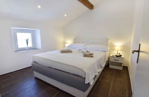 The holiday apartment is located in a townhouse and is modern, functional and in the typical country style furnished. The property is located in a holiday home area, on the outskirts. The domicile is also popular because of the sunny location. This property is a family-friendly accomodation. For common use are available: sunbathing area, parasol, sun lounger, grill possibility, terrace, garden furniture and court.LocationUmag, district Villania. The holiday apartement is located on a closed garden plot with meadow, limited by a fence. The landlord does not live in the house or on the property. The access goes directly from the main road (asphalted). Parking lot on the property. Specialair conditioner. Facilities: internet access (WLAN) and washing machine. PoolOutdoor pool (3 m x 7 m, depth 1,4 m, for common use). The pool facility can be used from the beginning of June to mid of September. Dogsallowed. Free of charge. DistancesShopping opportunity 1500 m, restaurant 1100 m, town center 5,5 km. For a relaxing holiday, a car is necessary. railway station in Kopar 30 km. airport in Pula 80 km. doctor, pharmacy, bank each 5,5 km in Umag. Main road 10 m. Children's playground 700 m.In summer: Punta beach 6,5 km in Umag (beach 7 km in Umag with meadow, sand, gravel, stones and bathing plateaus). Umag: golf 12 km, boat rental, boat launch each 6,5 km. tennis, fishing, diving, water sports each 7 km. mini golf 7,5 km and dog beach 8,5 km. DivisionHoliday apartment, 2 floors, 4 rooms (including 3 bed rooms), 100 sqm, in total 6 beds. Smoking is prohibited in the property. RoomThe entrance in your holiday apartment is located on the 1st floor and leads over an outside staircase and the terrace directly in the aat-in kitchen.1st floor: Kitchen with dining area (6 seats), electric stove (induction cooker, 4 plates), oven, extractor hood, dishwasher, fridge, microwave, coffee machine and electric kettle. Bathroom with washing machine, shower, 1 sink, WC and window. 2nd floor: 3 bedrooms each with 1 double bed. Bathroom with shower, 1 sink, WC and window. Living room (walk-through room) with TV and dining area (8 seats). with (garden furniture). Terms of lease and pricesIncluded in the priceOutdoor pool, internet access, air conditioning, parking place, electricity, gas, water, final cleaning, bed linen, hand towels, Wireless Internet access. Side costs-Additionally(Payable when booking)/local tax.Costs on the spot:/Obligatory:registration fee 7 € per person per stay.Deposit:No deposit.