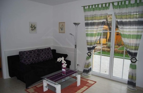 The apartment building consists of four identically furnished flats of the same size. The 5.5 m2 bathroom is equipped with a shower, WC and washbasin with vanity unit. The bedroom of 11 m2 consists of a double bed, 2 bedside cabinets and a five-door wardrobe with mirror front. The 24 m2 living/dining room has a kitchenette with a 2-burner electric hob, extractor fan, fridge, sink, coffee machine, toaster, kettle, microwave and crockery for 3-4 people. Furthermore, the equipment consists of a dining table with 4 armchairs, a sofa bed with living room table, a wall unit with satellite TV and free WLAN connection.