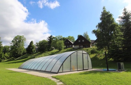 Čistá v Krkonoších 2 km from Černý Důl: Child friendly, beautiful, comfortable holiday village "Holiday Hill 42", 500 m a.s.l., surrounded by trees and meadows. 43 houses in the resort. On the outskirts, in a secluded, quiet, sunny position, 1.5 km from the lake, 3 km from the skiing area, in the countryside. For shared use: property 6 ha, meadow, swimming pool heated (9 x 4 m, depth 120 cm, seasonal availability: 15.May. - 30.Sep. pool opening hours: 09:00-20:00). Shower/WC in the pool area, table tennis, children's playground (swing, sandbox). In the complex: reception, central heating system. Parking (for 2 cars) at the house. Shop 2.5 km, grocery 2.5 km, supermarket 7.5 km, restaurant 1.6 km, pub garden 400 m, bus stop "Černý Důl, Čistá-pošta" 400 m, grass beach 1.5 km (small), indoor swimming pool 19 km. Golf course (18 hole) 14 km, tennis 2.5 km, sports centre 2.5 km, walking paths from the house 100 m, cycle lane 100 m, ski lift 3 km, chair lift 3 km, slopes 3 km, ski school 3 km, children's ski school 3 km, sled run 7 km, cross country ski track 100 m. Nearby attractions: Janské Lázně Spa 9 km, Vrchlabí 10 km, Aquapark Trutnov 25 km, Zoo Safari Dvůr Králové 29 km, Bozkovské jeskyně 37 km, Adršpašské skály 44 km. Well-known ski regions can easily be reached: Černý Důl 3 km, Herlíkovice 15 km, Pec pod Sněžkou 22 km. Well-known lakes can easily be reached: Čistá 1.5 km, Vrchlabí 9 km. Hiking paths: Sněžka 25 km.