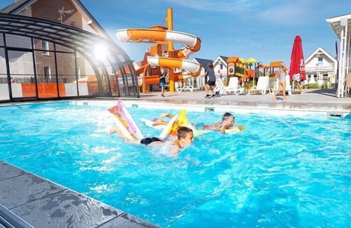 This family holiday resort in Sarbinowo offers high-quality, two-story homes within a safe, fenced area just 350 m from the beach. Each home has a living room with TV, double sofa bed, dining table, kitchen, bathroom with shower, and two bedrooms upstairs (one with balcony). Covered terraces with garden furniture, electric heating, and WiFi complete the accommodation. The resort features a water attractions complex (01.06–14.09) with a pool, two slides, and a whirlpool, plus playgrounds, a playroom, sports fields, barbecue areas, a snack bar, and secure parking. From 08.06–06.09, children can enjoy an all-day entertainment program. Bed linen, water, internet, access to the water attractions, and parking are included; baby cot, high chair, and bathtub available on request. Sarbinowo is a charming west coast summer resort with clean, wide beaches, perfect for family trips. Nearby attractions include the Museum of the Fishing Village in Chłopy, Pomerania Fun Park, and the international R-10 cycling trail around the Baltic Sea.