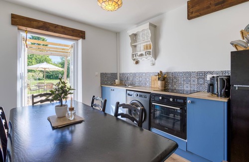 This quietly situated holiday home in Savigné offers you the ideal retreat for relaxing days in the countryside. Enjoy the historic ambience of a lovingly restored house and leave everyday life behind you. Discover the inviting living area with cosy seating area and stylish details. Cook in the practically equipped kitchen with modern comforts and enjoy your meals at the rustic dining table. The mixture of historical elements and fresh colour scheme creates a particularly homely atmosphere.