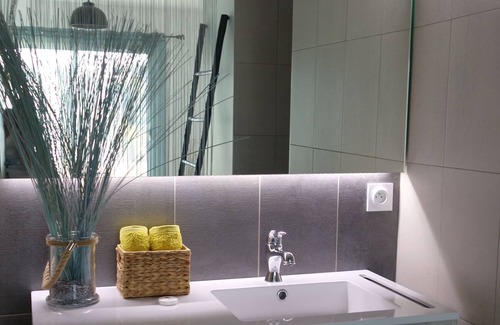 This housing, labeled 3 ***, is located on the ground floor of a contemporary house with an independent entrance. It can accommodate 2 people. It includes a large bedroom with dressing room and office area, a shower room with a separate toilet, a kitchen and a covered terrace with garden furniture.