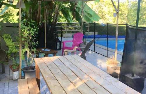 and family relaxation. It is ideal with friends or family up to 6 people. The site is planted with palm, banana and fir trees and has its private swimming pool 5 X 10 m and a large terrace facing south.