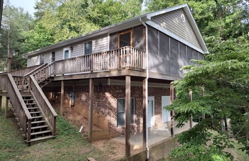 This is a great quiet get away location at Hyco Lake located on the south end of the lake without a lot of boat traffic. House has two main floor bedrooms, 3 full baths, Kitchen, Dinning area and Living room. There are two pull out sofa beds in Living room. Each main floor bedroom has a queen bed. The master bedroom has bathroom inside room. The second bathroom is in the hallway. On the bottom floor there is a bedroom with two twin beds and a third bathroom. Note that the bottom floor bedroom is only accessible from an outside door on bottom floor porch as there is no staircase inside. The Living and Dining room have windows facing the lake with doors that open up to a screened in deck with a swing. There is a concrete patio below the screen in deck where the gas grill is located.