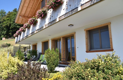 We live on the top two floors of the chalet and have a holiday home available on the bottom floor, called "Im Bergli" with private entrance and terrace, which can be a good home base during a wonderful holiday or a working visit in Switzerland. The home is fully equipped. There is a double bedroom and a small bedroom for 1 adult or up to two children. An open kitchen in a living room with a sitting area and a dining area with beautiful views of the mountains. Directly in front of the dining room you have a private, partially covered, terrace and you also have a lower located (accessible via stairs) private parking space in front of the chalet. Also look at imbergli, followed by dot and then ch for more information.