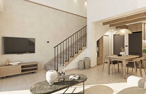 The villa spans approximately 70 sqm of indoor living space and 93 sqm of outdoor area, making it ideal for groups or families. The villas feature a spacious open-plan living area, where guests can relax on a comfortable sofa while enjoying modern amenities such as a 50 Smart TV with satellite channels. Large sliding doors provide access to private terraces or the pool area, creating an easy flow between the indoor and outdoor spaces. The villa has a fully functional kitchen, allowing guests to prepare meals with ease, and the dining area offers a welcoming space for shared meals.