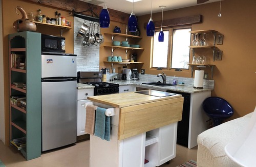 The casita is a free standing house, featuring a one bedroom, Queen bed, fully equipped kitchen,radiant heat, skylights and great room with French doors leading to a private patio surrounded with topiary. Outside the bedroom is a meditation garden. All utilities are included plus High speed Internet, Cable TV, Netflix, Hulu, etc. W/D in unit, non-smoking,