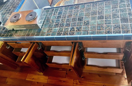 Inside is a cozy sitting area, which is perfect for reading or watching TV; the free-standing copper fireplace creates a mid-century vibe, and the clean, efficient kitchenette is well organized, with two counter-height Sub-Zero refrigerators, a microwave, a coffee maker, a toaster, and a hot plate. Equipped with tableware, pots & pans, coffee & tea, basic spices & oils, and cleaning supplies, you have the choice of dining inside or stepping out to the patio table to enjoy the ocean breeze.