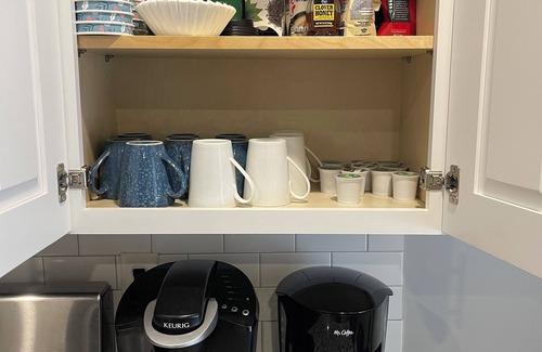 Entry into the kitchen from sidewalk right next to our private off street parking pad. White shaker cabinets, stainless steel appliances, stocked kitchen for cooking and dining in, and a coffee bar. Cool brick arch between the kitchen and living room. Living room has a couch that can fold down into a queen size bed, 55 inch smart TV, and has an adjoining half bath. Spiral staircase up from living room to the office room that has a Murphy bed that can be used for additional guest at an extra cost. The full bathroom is also off this space. The bedroom is the next room with a queen bed with memory foam mattress. Closet with hangars and a foldable luggage rack, and a Roku TV mounted on the wall. Private deck off the bedroom with two teak rocking chairs perfect for enjoying the beauty of Orchard street with a cup of coffee.