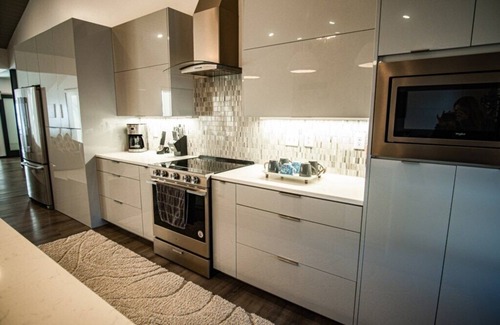 This 5-bedroom, 4-bath home, has just undergone a complete top-to-bottom renovation with a modern-industrial vibe that will take your breath away! The kitchen is custom designed with a 10x8 island with quartz top and waterfall edging, and an unbelievable walk-in pantry cleverly hidden behind the cabinetry doors with an extra refrigerator, and plenty of shelves to hide all your food, drinks, and snacks. Whether you are cooking or reminiscing around the island, you will not feel left out of the group with the open living room and kitchen concept. Enjoy lakeside dining in the massive dining area (seats 14+) and 2 booth style "kids tables" that seat over 6. This home has a large master bedroom on the main level with a king size bed suite and fireplace, an office space off the kitchen/living room with a Murphy bed (full size bed). The upper level has 4 bedrooms and one ultimate guest suite that includes a coffee bar, dual beverage fridge, a shower, king bed, large soaking tub, and vanity room.