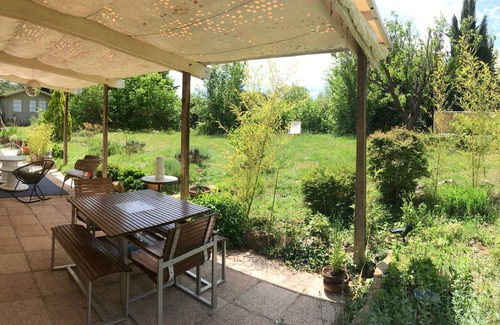 It is an ecological villa in the heart of Green Provence. The villa is quiet on a plot of 2000m2 with tubular pool (private) 4.57m. There are two beautiful sheltered terraces equipped with tables, chairs and an outdoor lounge. The house has two double bedrooms, one with a double bed on the mezzanine (and possibility of adding a single bed on the ground), a living room with American kitchen, a shower room and separate toilets (dry) and dry toilets. outside too.