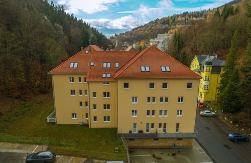 Modern apartment block, 4 storeys, built in 2023. In the centre of Jáchymov, 2.5 km from the skiing area. In the house: lift, central heating system. Breakfast on request (extra). Storeroom available. Parking at the house. Grocery 100 m, supermarket 150 m, shopping centre 6 km, restaurant 100 m, pub garden, bus stop "Jáchymov" 150 m, outdoor swimming pool 15 km, indoor swimming pool 150 m. Walking paths from the house 10 m, cycle lane, chair lift 2.5 km, slopes 2.5 km, ski rental 2.5 km, ski bus stop 30 m, ski school 2.5 km, cross country ski track 5 km, ice rink 6 km, children's playground 500 m. Nearby attractions: Aqua Centre Agricola 500 m, Spa&Wellness Centre 500 m, Boží Dar 8 km, Karlovy Vary 20 km, Oberwiesetnhal 13 km, Annaberg-Buchholz 33 m. Well-known ski regions can easily be reached: Klínovec 2.5 km, Plešivec 13 km, Fichtelberg 11 km. Hiking paths: Krušnohorská magistrála, Ježíškova cesta. Please note: baby equipment on request (extra). Smoking is prohibited in all areas of the building and, with the exception of the ground floor, the use of ski boots is also prohibited.