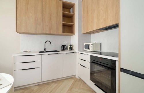 The kitchenette is equipped with everything you need to easily prepare delicious meals. Guests have access to modern appliances: an induction hob, oven, dishwasher, refrigerator with freezer, and microwave. Amenities such as an electric kettle and a capsule coffee machine will make preparing breakfast quick and enjoyable.