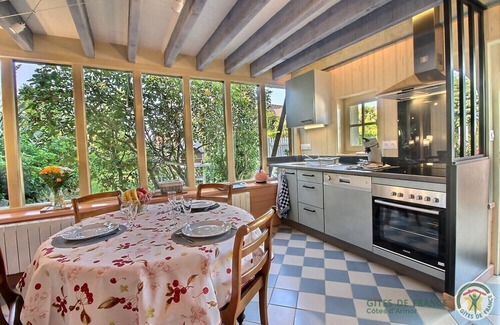 Your vacation rental includes on the ground floor: a living room kitchen. Upstairs: a landing with lounge area, a bathroom (shower, basin and wc), a bedroom with 1 double bed. 140x190 (including storage and desk) giving access to a second small bedroom with 1 single bed. 90x190 (including storage and desk). At the back of the gîte, a lean-to contains the laundry room and storage (type bicycles, etc.). In front of the gîte: paved terrace of 9 m² and garden area with fixed barbecue of 80 m², all delimited by gates and boxwood hedge. Dedicated parking space, for 2 vehicles easily. Gite adjoining a garage not used by the owners and located more generally in a property of at least 4000 m² with a park full of trees and flowers. Ker Désirée is a little nest nestled in the garden of an old, typically renovated farmhouse. We don't say that everything that is small is cute! Pleasantly decorated by Armel and Muriel, with nods to black and white postal calendars, Ker Désirée, with cocooning comfort, is nevertheless large enough to offer you peace and nature. Really located between land and sea, it will be a perfect place to discover all of the Côtes d'Armor (RN12 at 650 m). Among other things, you will be able to discover Binic, 'beauty spot of the Côtes d'Armor' 17 km away on the coast, just like Paimpol 33 km and ... 6 km further on the pier for the Ile de Bréhat. An original outing 9 km to the Zooparc de Trégomeur can be scheduled. More broadly, you will be halfway (60 km) between Perros Guirec (the famous Côte de Granit Rose) and Cap Frehel (the sumptuous Côte de Penthièvre). Visits and idleness in perspective! Welcome to Désirée!