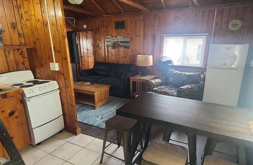 This beautiful knotty pine 2 bedroom, 1 bath cabin features a Queen Bed and a Twin over Double (Full) Bunk Bed. The Kitchenette is equipped with a refrigerator, stove/oven and microwave. Enjoy your morning coffee or evening beverage overlooking the lake from the picnic table outside your door.