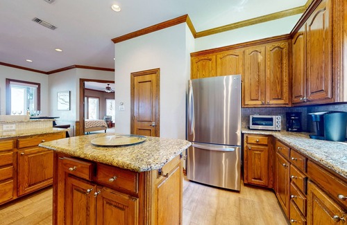 You and your guests can spread out and relax at this sprawling vacation rental, complete with deluxe amenities and high-end comforts. This red brick estate is the perfect home base for your next big family vacation, reunion, or holiday celebration. The spacious living room features a beautiful view of the lake and lots of natural light. The well-stocked kitchen comes equipped with a full suite of stainless steel appliances, a large sink, and hard-surface countertops. Two coffee makers, dishes, and drinkware are provided along with all of the utensils and accessories you need to help whip up mealtime masterpieces for your entire crew. When it’s time to eat, choose from a combination of indoor seating as well as several tables and chairs on the main deck and tiki bar area. There you’ll find an outdoor kitchen complete with a sink, beverage fridge, and gas grill.