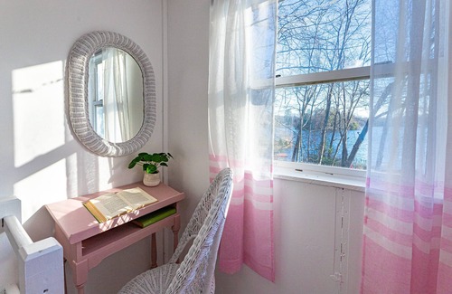 ● The "Pretty in Pink" Room (Upstairs) - 1 King Bed, Closet, Bureau, Workstation, “Pink” Record Player, Bed Linens, Window Air Conditioner Unit (Spring/Summer), Water Views