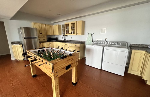 Enjoy privacy in the basement with a private bedroom that features a king-sized bed and direct access to the outdoor patio.