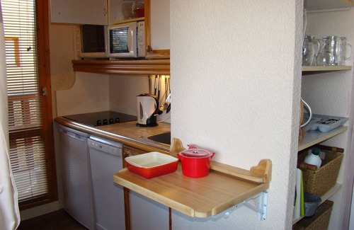 The front door opens into an entrance hall with coat hooks and wardrobe, giving plenty of space for your coats. The living room is comfortable and attractive with two armchairs covered with leather sofa beds with cushions, two stools and a HDTV. A lamp provides an adjustable lighting. On the shelves there is a DVD player, a radio with iPod dock and a selection of books and DVDs. The living room can be closed by a curtain when the sofa is used as a bed, giving more privacy. There is a panoramic view from the window; the glass door opens onto the balcony (with a bench and chairs) where you can sit and admire the mountain scenery. The oak table is extendable to six seats to accommodate four or retracted, giving more space. The well equipped kitchen has a fridge, dishwasher, oven, microwave, slow cooker, toaster, coffee maker and electric kettle. There is a fondue so you can enjoy a Savoyard evening.