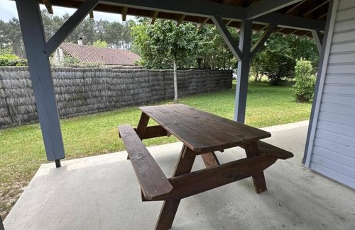 Domaine de l'Étang welcomes you for a fun family vacation. Just for you: pétanque, a bike ride in the forest... Enjoy a good mood and relaxation in the heart of the Landes de Gascogne Regional Natural Park. These wooden chalets allow you to unwind and spend quality time with your whole family in a comfortable setting. For a nature stay, this is the place! A small village with 12 gîtes. Gîte comprising: a living room with kitchenette, bathroom with walk-in shower, 1 bedroom (1 double bed with pillow and blanket), separate toilet, 1 convertible sofa bed (140 cm) in the living room. Amenities: Microwave, mini-oven, 2-burner induction hob, refrigerator/freezer, kettle, coffee maker, toaster, flat-screen TV, clothes horse, shared washing machine and dryer, On request: ironing equipment - plancha Free public Wi-Fi. Electric heating included from November 1 to May 1. If used outside of November 1 to May 1, it will be charged extra (€6 per day). For short stays of 3 nights or less, disposable sheets are available for rental. For all other stays, fabric sheets are available for rental. End-of-stay cleaning fee available upon request. Baby crib, booster seat, and bathtub available upon request. Covered terrace Garden furniture. Unfenced grounds shared by all tenants. Parking. Free public Wi-Fi. On-site: bowling alley, pediment, volleyball, table tennis, orienteering sports area, labyrinth, Ecobalade, tennis, intergenerational playground, mountain biking. (Pond not suitable for activities). For more than one pet, please contact us.