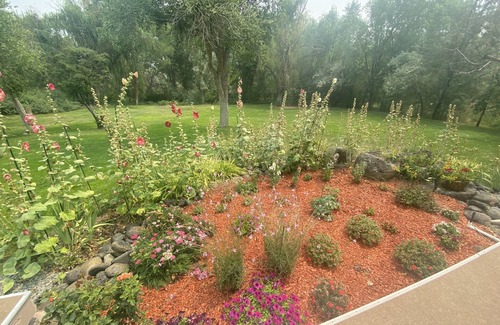 Experience life on a ranch with a gorgeous view of the Grand Mesa! Our "Barndominium" is a 2 BR (more like 1 1/2) remodeled upper level living quarters of an older barn. Enjoy roaming around 70 acres of horse ranch with 27 horses to learn their names and pick your favorite. Watch horses in training, chickens laying eggs pet the goats in the petting zoo. The cows and bulls are too. The star of the show for the kids is our miniature Donkey named "BoMama". Bring your pet and walk around our ranch to unwind and enjoy nature. Kids will love playing on the swing set/play house. There is a queen sized bed with an adjoining bedroom area to accommodate a comfortable twin sized bed. In the great room there is also a queen sized "Murphy Bed" for additional sleeping space. This is one of 4 rental properties on the ranch which makes for a great family and friend gathering or a fun space for a reunion or event, including weddings. We even have an RV space that can hookup to water and electricity for rent. We also have EV charging on site up at the workshop. Come check us out!