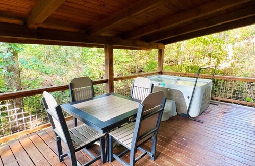 From the hardwood floors to the A-frame ceiling supported by roughhewn beams, your surroundings exude rustic comfort. Stretch out on the comfy sofa or lounge in the oversized chair as you binge-watch your favorite shows on the 50 inch Roku TV. Flip the switch to ignite the fireplace encased in hand-cut stone and curl up with a good book or take a much-deserved nap. Windows on each wall and in the ceiling's peak allow plenty of natural light and outdoor beauty to enter your hideaway. And the fireside table, bench, and chairs are the perfect place to enjoy your breakfast or remember why you loved playing that old board game you brought along just in case.
