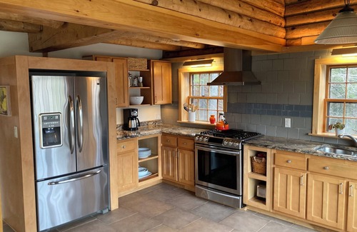 The cabin is tastefully modernized by Danish builder, and the open concept kitchen, dining room, and living room with rows of huge, panoramic windows offers amazing views of mountains and front row for leaf peeping.