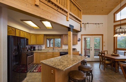 This warm and inviting 5 bedroom, 3.5 bathroom log cabin across from the lake is the perfect place for your family retreat! There is a great room on the main level with TV, a walk-out basement level family room with pool table and TV, and large deck with seating all provide plenty of spaces to relax and have fun. The dining table seats 6 and there are 3 bar stools at the kitchen island.