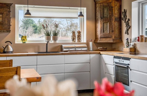 Look forward to a wonderful time out with family or friends in this cosy holiday home on an idyllic island. Inside the house, you will find a stylishly furnished living area. Cosy up in front of the crackling wood-burning stove or enjoy your meals in the spacious kitchen with dining area, which invites you to cook together. The spacious living room with its comfortable seating offers plenty of room to play games or read in peace with the whole family.
