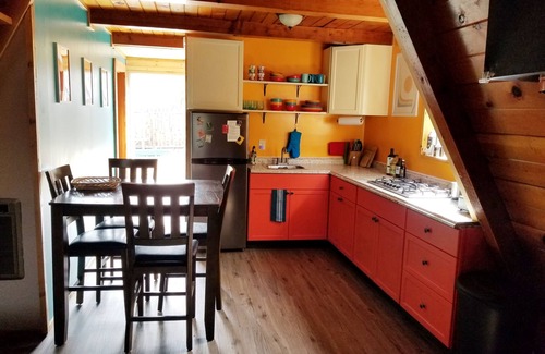 Come relax and enjoy the charm of this 800 square foot mid-60’s A-frame cottage, with knotty pine interior and exposed timber structure. The space is fully furnished with one queen bed on the ground level, and two beds in the loft (full and twin). The fully-stocked kitchenette and bathroom have been recently upgraded with new fixtures, including a bathtub to soak in after a long day of adventures.