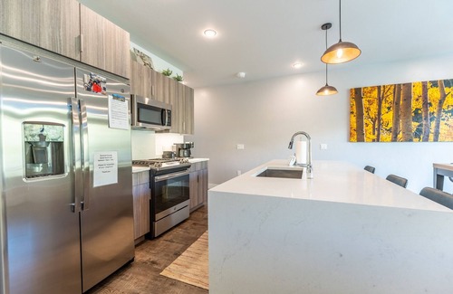 This newly constructed 2-bedroom, 2-bathroom condo sleeps 6 with a king sized bed, queen bed, twin top bunk and a twin size sleeper sofa in the living area. It features hardwood radiant heat flooring, a private balcony with gorgeous views and sounds of the Blue River, private in-unit washer and dryer, and modern finishes throughout. The River West Condos offers a shared hot tub, fire pit's + benches, and walking path's along the Blue River. Guests can also quickly access to all of the shops, restaurants and conveniences of Silverthorne while still being close to everything else Summit County has to offer including Keystone, Breckenridge, Copper Mountain, Loveland, A Basin, and golf courses like Keystone River, Keystone Ranch, Breckenridge, Raven Golf Club and more.