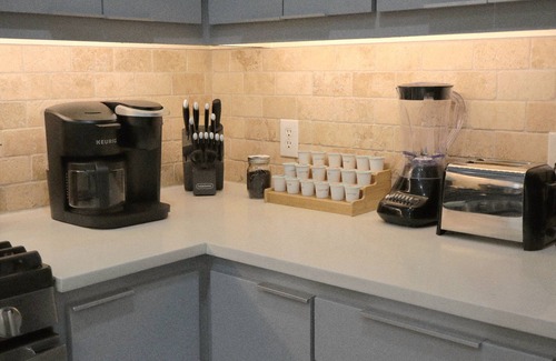 The chef’s kitchen comes with complimentary coffee and a fully equipped with stainless steel appliances, granite countertops, and all the cookware you need—whether you’re making a quick breakfast or hosting a dinner with friends.