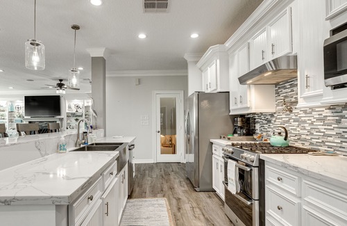 Galveston is just the place to get some sweet sunshine and make the best beach memories, so make your way to this Newly renovated five-bedroom home located in prestigious Pirates Beach West with all the extras! Boasting a beautiful pool area with a tiki bar, flat-screen TV, outdoor surround sound, and an enclosed hot tub, you will have your own private oasis right at your fingertips. Inside, you will find two living areas that include a spacious game room, plush leather furnishings, and large flat-screen TVs that are more than ready to stream favorite movies and shows. The home office, home gym, three stairways, elevator, decks off three of the bedrooms, a fireplace, and bathrooms adjoining each bedroom are the cherry on top! When you make your way back from full days of adventure, the gourmet kitchen is equipped with a gas range, stainless steel appliances, and wonderful countertops, so you will have no trouble enjoying tasty meals without having to head out each night to a local restaurant. Plus the beach is only a short walk from this fantastic home! With plenty of room for an extended family gathering, this exquisite, beachfront home is sure to be the repeat vacation location.