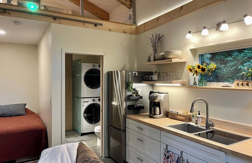 Get cozy in this brand new, surprisingly spacious, tiny home. Stargazing and sunset views from the hot tub are perfect after a day of hiking or exploring nearby Asheville/Black Mountain. Enjoy the privacy of being nestled in the woods on a mountain, while being next door if you need anything. It’s the perfect space for a couple and dog. With a full kitchen, laundry, and dishwasher, you won’t miss any of the modern conveniences.