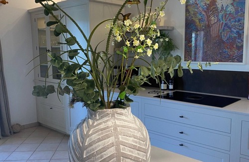 The villa has a comfortable stylish interior, furnished to a high standard. Four double bedrooms are well appointed - 3 in the main villa (two twins and a master with king 4-poster/ en-suite) plus a very spacious king bed en-suite across the terrace in the pool house (perfect if one couple or grandparents want a bit of privacy). All bedrooms have french windows opening to the garden. Two open directly onto a lovely deck, one onto the pool terrace. Large family bathroom and a separate loo in addition to the en-suites. The spacious, high ceiling living room opens out onto the terrace, pool and garden. Enjoy squashy sofas, UK TV, games, DVDs, reversible air-con/heating, plus good wifi. The luxury kitchen has granite worktops and is very well stocked with equipment. There is a separate utility room with all laundry facilities should you need them.