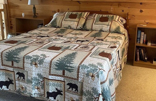 This log cabin has one bathroom and one designated bedroom with queen bed. There is a queen bed and sleeper sofa in the loft and a queen sleeper sofa in the living room. A flat-screen TV with a DVD player is provided in the loft and a Roku tv in the main living area. WIFI is available. The kitchen is stocked with a dishwasher and most of your cooking needs other than your food.