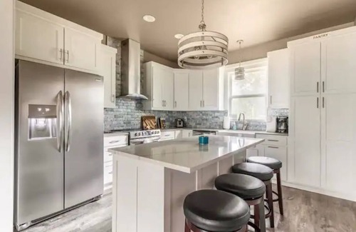 Charming 1350 Sq foot elevated house nestled between two large pecan trees. This house has been completely renovated, literally from the ground up, as it has been lifted 14-feet off the ground. Modern kitchen with composite counter-tops, all brand new appliances including Refrigerator, Flat top Electric Stove, Microwave, Dishwasher and Stove Hood with fan. Lots of kitchen storage with pull out pantry shelves. All 3 bedrooms have ceiling fans, and the house has central heating and AC. Master Bedroom has King sized bed, large closet, it's own bathroom with tiled walk-in shower and dual vanity sinks. The 2nd Bedroom has Queen sized bed and large modern closet. The 3rd and smallest bedroom has a bunk bed (Twin over Full) that can comfortably sleep 4 small children, or 2 adults with a child. The second guest bathroom has dual vanity mirrors and sinks and a large tiled walk in shower. This cozy house has high speed WiFi, 4 wall mounted TV's, one in each bedroom and large 58" TV in living room. Comfortably sleeps 7 guests in bedrooms and 1 on the couch. You can squeeze in a few extra people (up to 10 max) with small air mattresses. House comes with small balcony outside, and a fire pit and BBQ on the bottom floor. The yard is .20 of an acre and is fully fenced to bring a small or medium sized dog. All composite wood flooring throughout entire house for easy cleanup and durability. Come enjoy a relaxing getaway next to Lake McQueeney with across the street lake access via our residential community park. Amazing bass and catfish fishing !!!